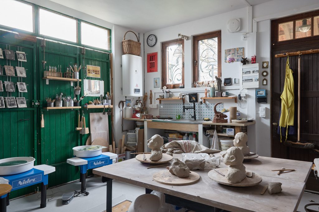 L’atelier est entièrement équipé : tours de potier, tables de travail, outils, émaux et engobes. Les cuissons sont assurées par nos soins.